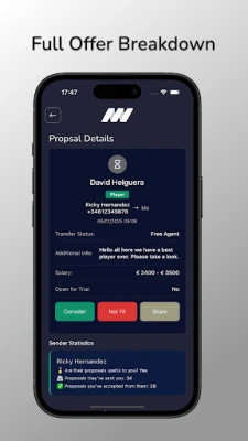 Add collaborators, such as scouts or club staff, to stay aligned during negotiations. You’ll receive real-time notifications when proposals are accepted, rejected, or updated. Once both parties agree, NegotiateWind automatically generates a final PDF agreement for your records.