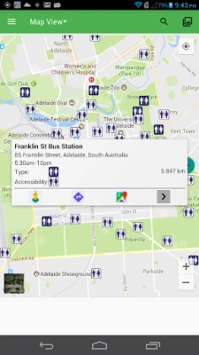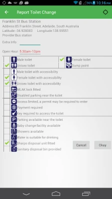 This is an awesome App which will bail you out of a sticky situation, since it can filter restrooms by toilet types, accessibility types(male, female, unisex, LHT, RHT, ambulant, parking, MLAK) and extra features (parking, babychange, adultchange, shower, water, sharps, sanitary) supplied.